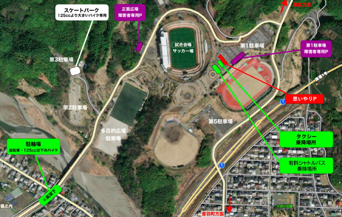 ●試合終了後、第2駐車場・第3駐車場・多目的広場駐車場から出る際は右折禁止となります。また、出庫後は葉梨方面への誘導となります(音羽町方面へは行けません)