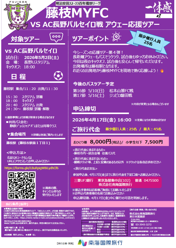 5月2日(土)18:00キックオフのアウェイ AC長野パルセイロ戦にて、南海国際旅行主催の『藤枝MYFC アウェイ応援ツアー』を開催いたします。